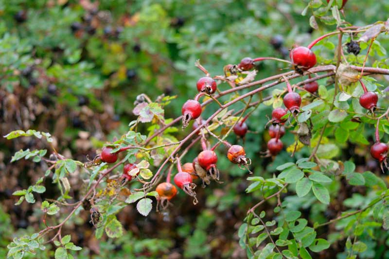 Höst: Pimpinellrosor står gröna länge och flera sorter får fina höstfärger samt runda svarta nypon, som är dekorativa. Ingen annan ros får så mörka nypon.