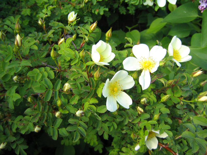Plena‘, Finlands vita ros, blommar rikligt på försommaren med vita halvfyllda blommor med gul mitt, som ytterst sällan bildar nypon. Den kan bli 2 m hög och lika bred, är mycket tålig, anspråkslös och härdig i hela landet. Den har ett fint bladverk, ett tätt och kraftigt växtsätt och skjuter många rotskott. Tål skugga.