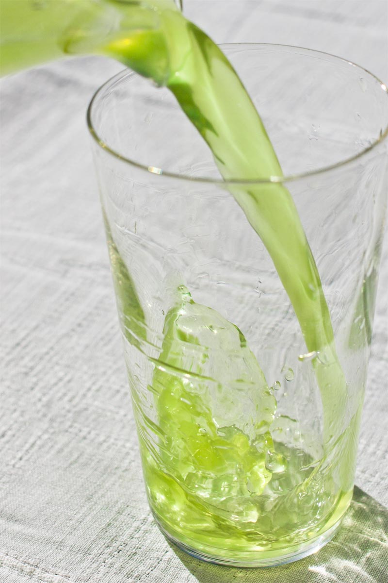 Bland alla rosa, röda och gula safter är det roligt med andra färger ibland. Violsaftens färgskiftande grön-blå-lila är festlig, men det är få förunnat att hitta så mycket luktvioler och tålamod som krävs. En grön saft borde väl däremot vara lätt, med tanke på hur vanlig färgen är i naturen? Inte riktigt, visade det sig. Klorofyll, som den gröna färgen kommer från, är nämligen vare sig vattenlöslig eller särskilt stabil. I kontakt med syre, syror eller de enzymer som redan finns i växten blir den snabbt brunaktig. Med lite krångel går det ändå att göra en vackert grön och god saft, men av nödvändighet utan syrlighet. Servera den med en skiva lime, ringla den över glass eller ha den i en drink.
